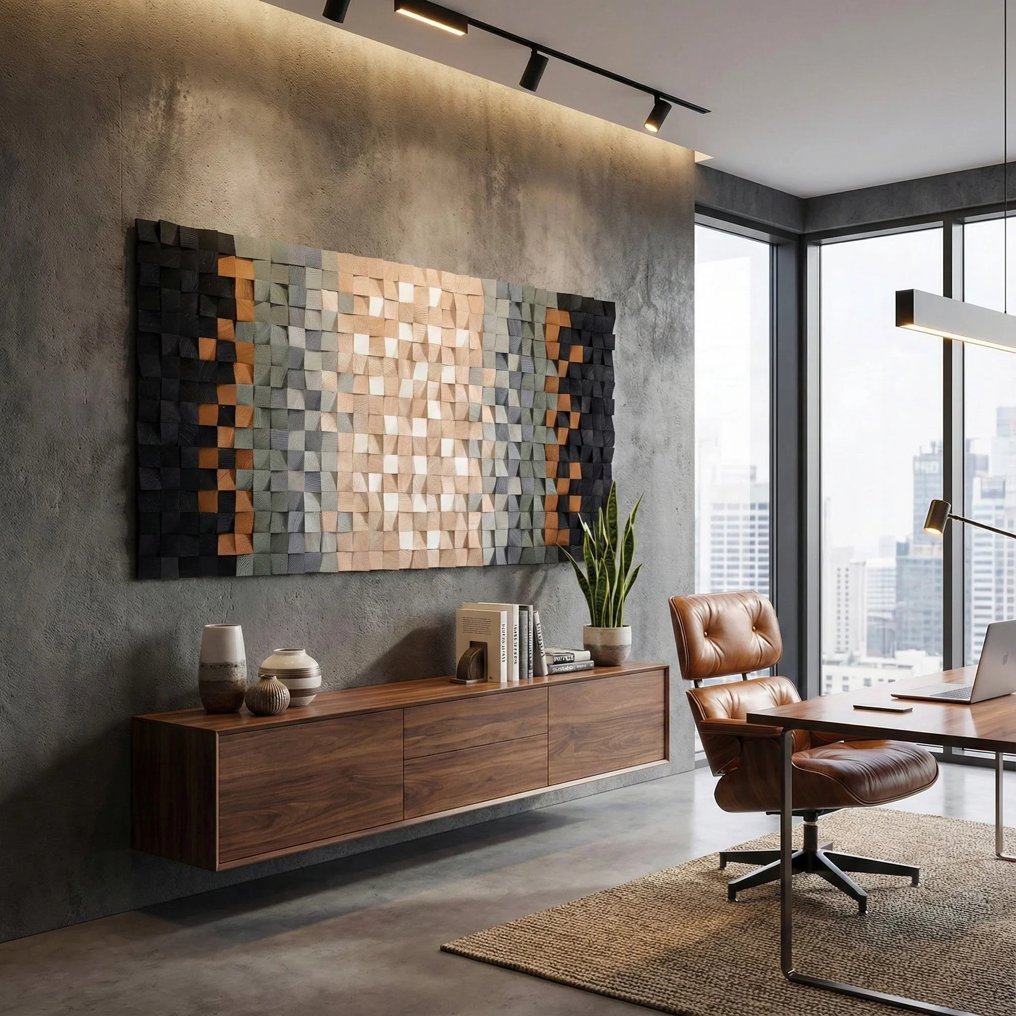 • In this remarkable rustic wooden wall decor series, our designers cut each small cube by hand and sand them individually. These pieces are painted separately with premium coloring to enhance their beauty and shield the wood at its finest. After painting and drying, the parts are attached to a wooden surface by a maximum-hold adhesive.