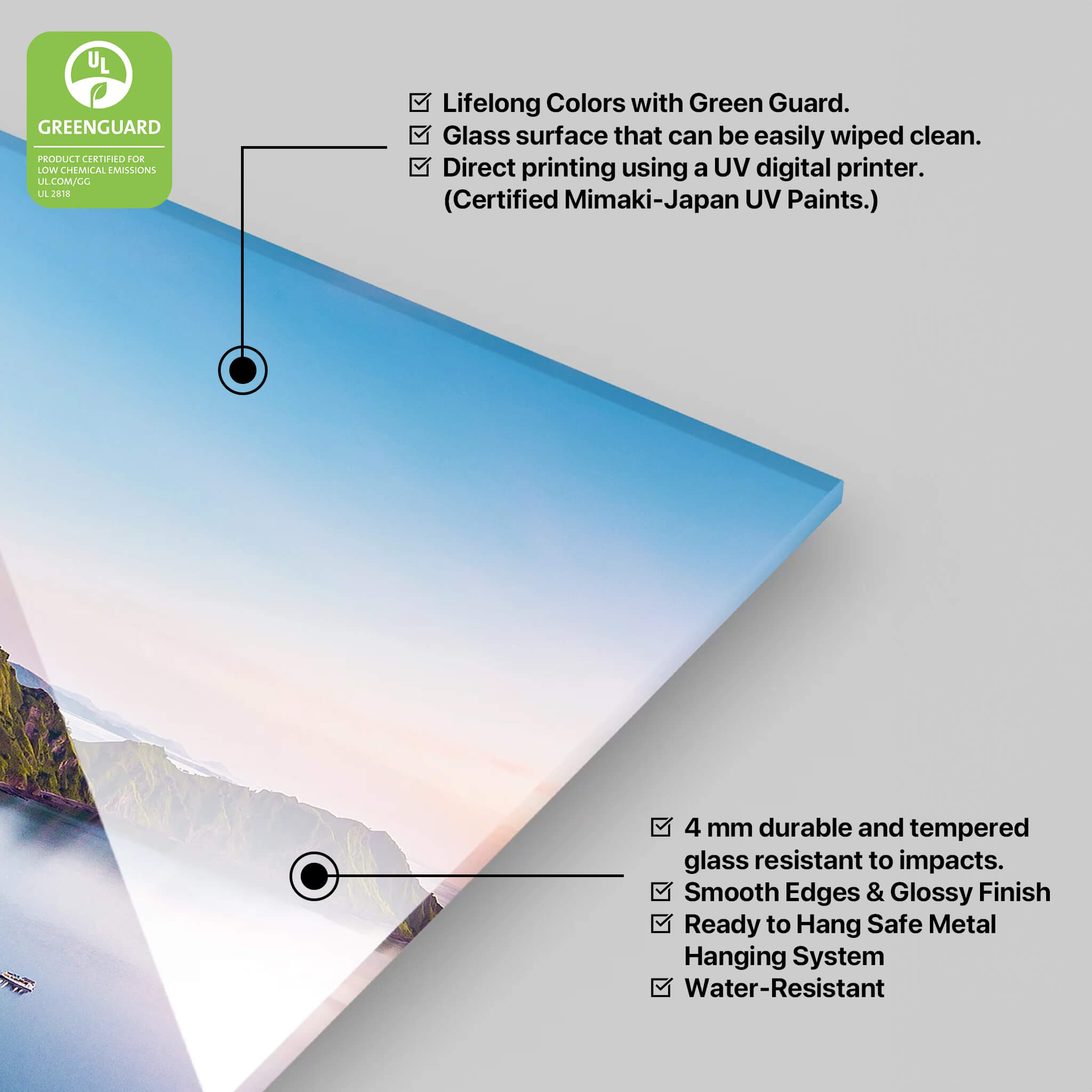 Frameless Glass Prints that elevate your space with a sleek and modern look. Our top-of-the-line printers use advanced technology to capture every detail with their 5 picoliter droplet size, producing sharp and high-resolution images that are sure to impress. The polished glass edges add an extra touch of elegance and ensure your artwork looks great from every angle, while the smooth texture makes it a pleasure to touch. Transform your walls with our Frameless Glass Prints and experience the ultimate combination of style and quality.