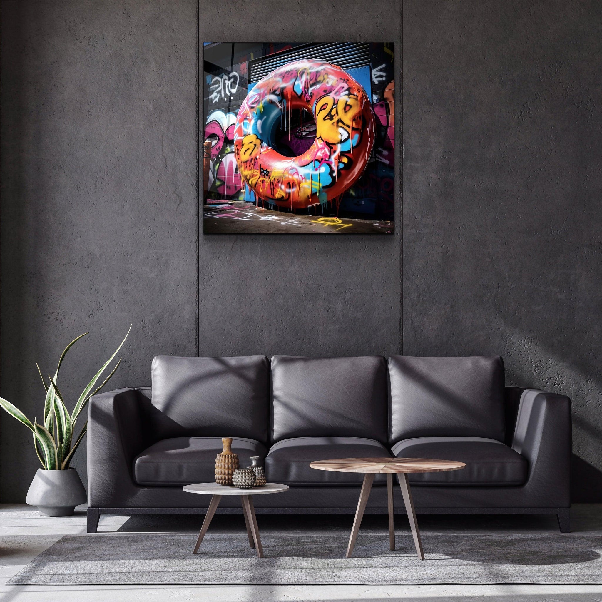 Keywords: graffiti glass wall art, urban street art decor, contemporary glass wall decor, bold pop art wall art, vibrant graffiti donut wall art.