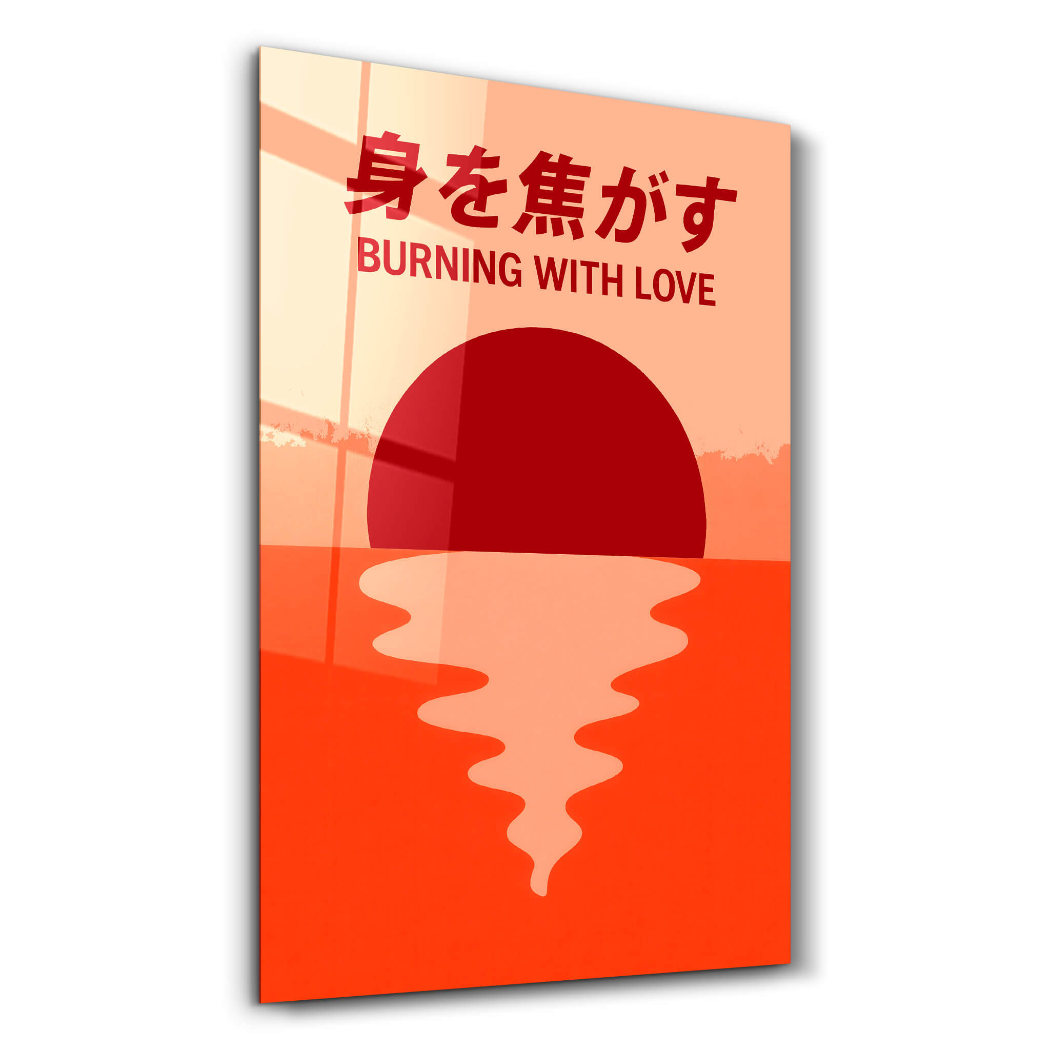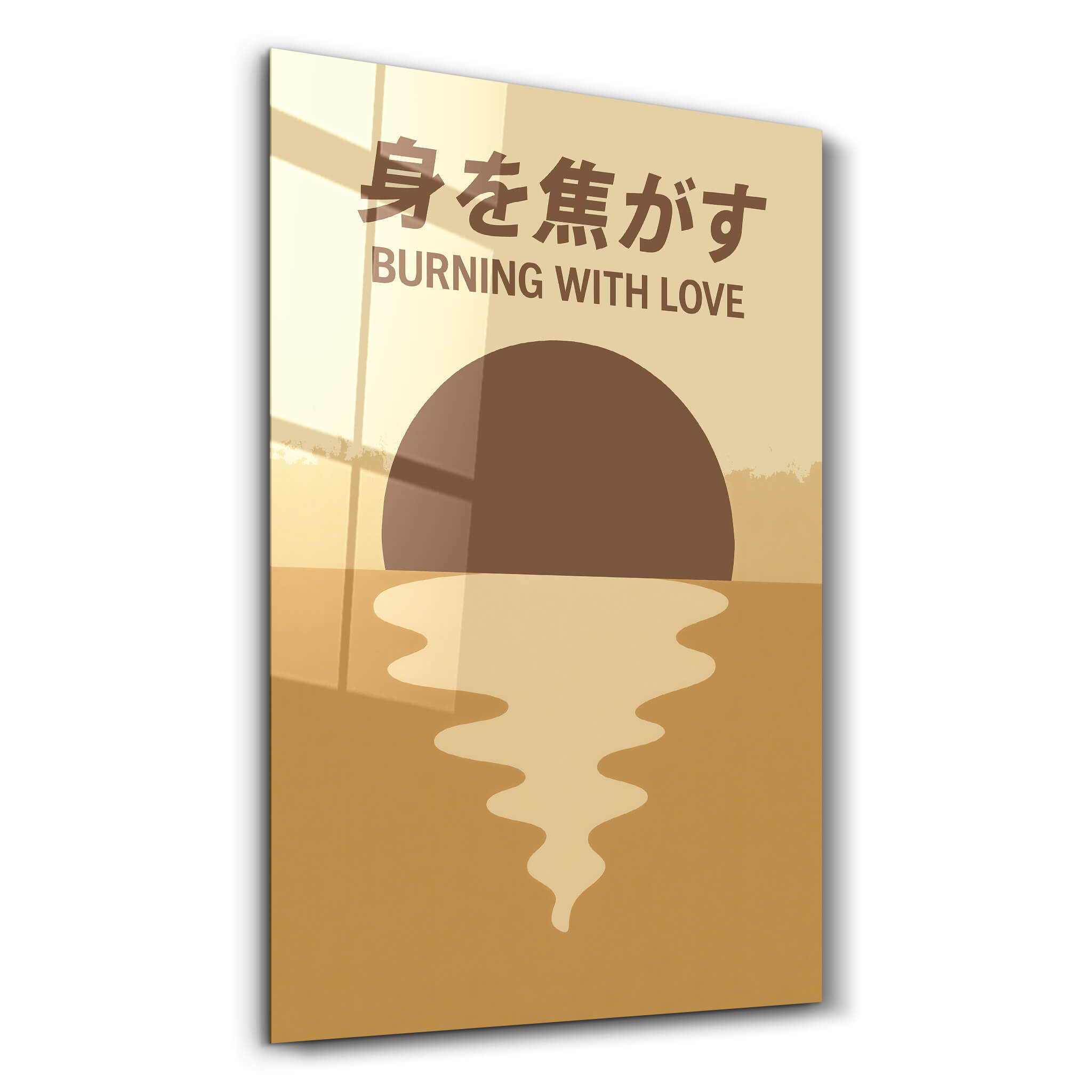 Dive into the emotion of longing, passion, and poetic simplicity with our "Burning With Love" glass wall art series—a collection that blends bold minimalist design with heartfelt expression. Each piece features a stylized sun dipping into reflective waters, casting a mesmerizing mirrored ripple beneath. Accompanied by the Japanese text "身を焦がす" and its English translation “Burning With Love,” this artwork channels deep emotion through a visually powerful yet clean aesthetic.