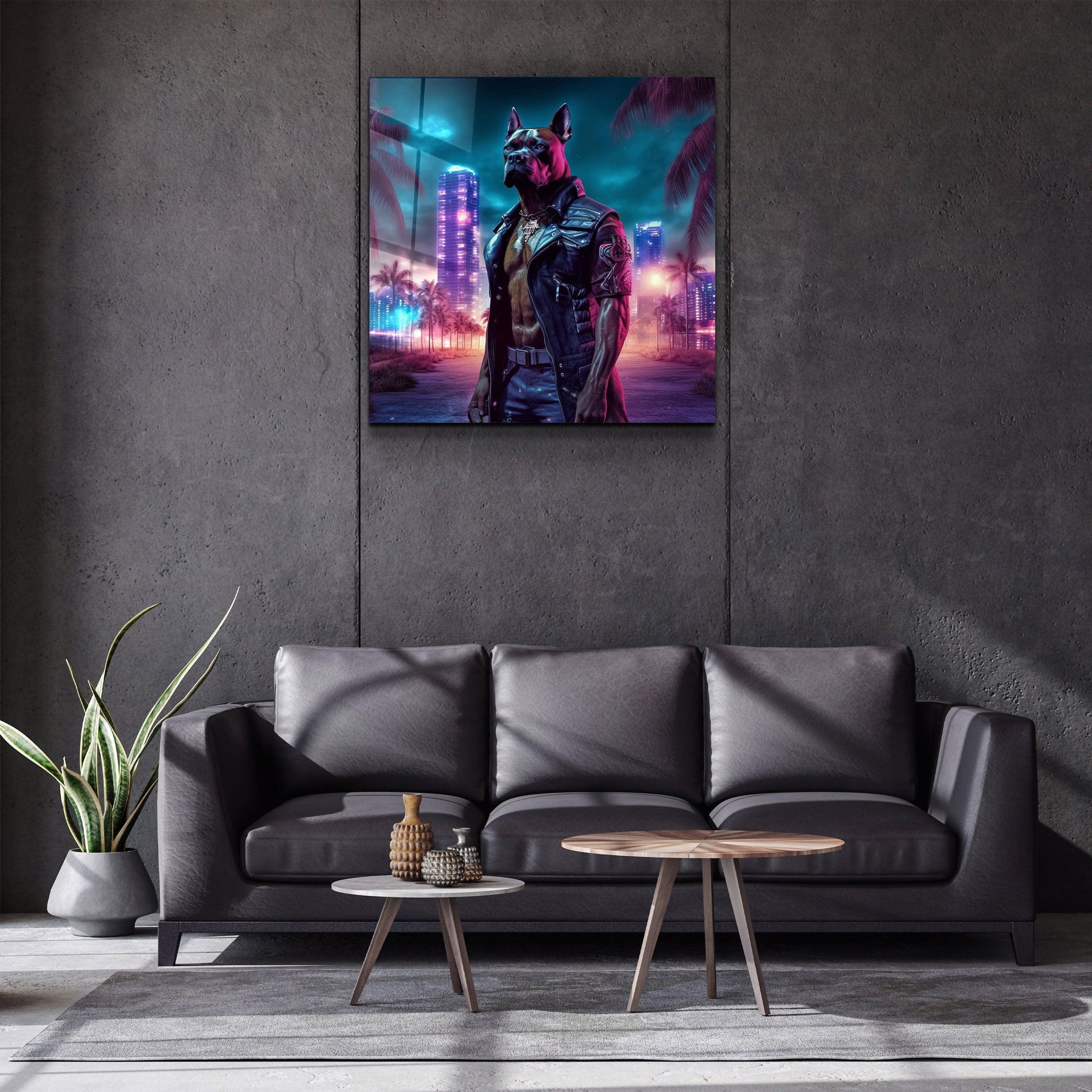 cyberpunk glass wall art, futuristic dog wall decor, neon cityscape wall art, bold urban glass decor, sci-fi inspired wall art.