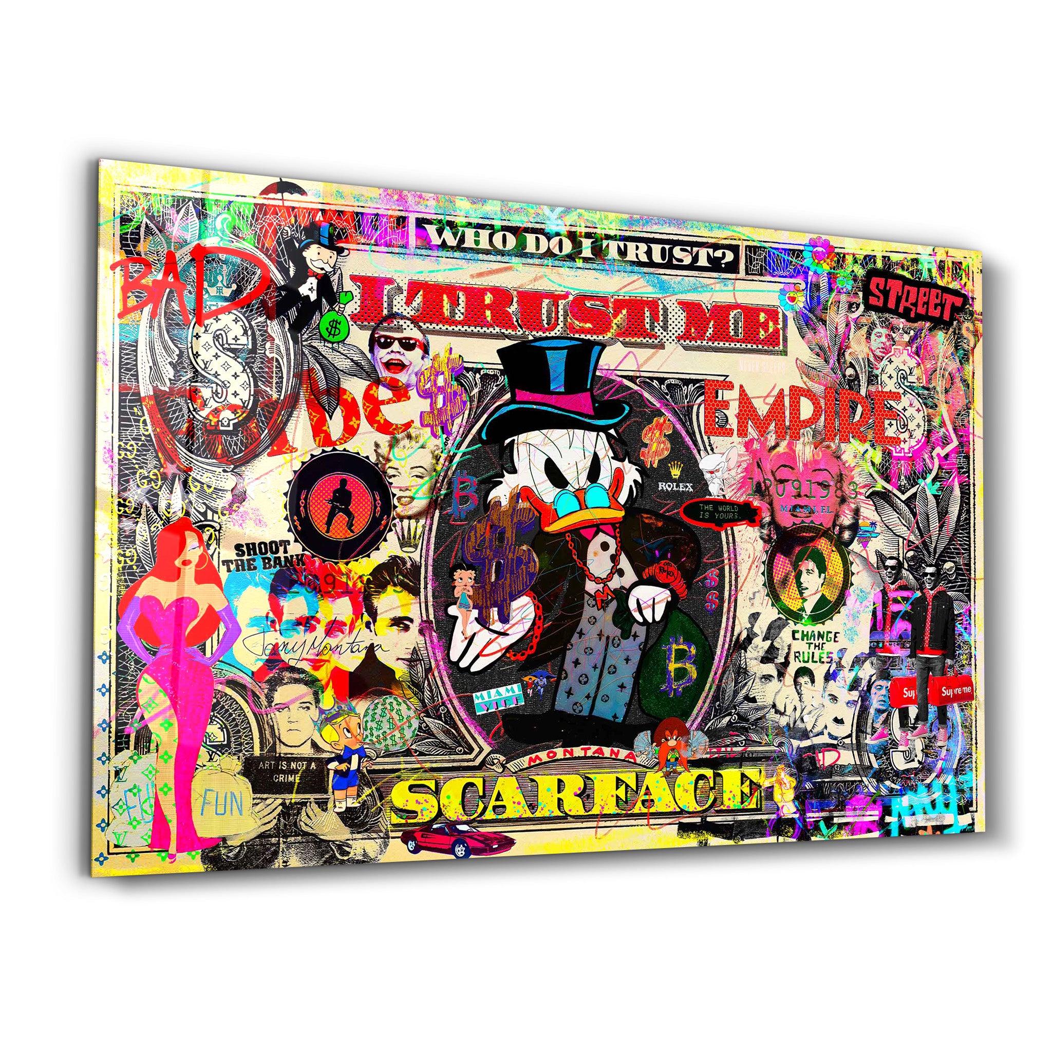 “I Trust Me” is a riot of rebellion, excess, and irony, brought to life by visionary pop artist Mr. Pablo Costa. Starring a gangsterfied Scrooge McDuck channeling Scarface energy, this piece mashes up crypto chaos, vintage icons, luxury brands, and political punchlines in a way only Mr. Costa can.