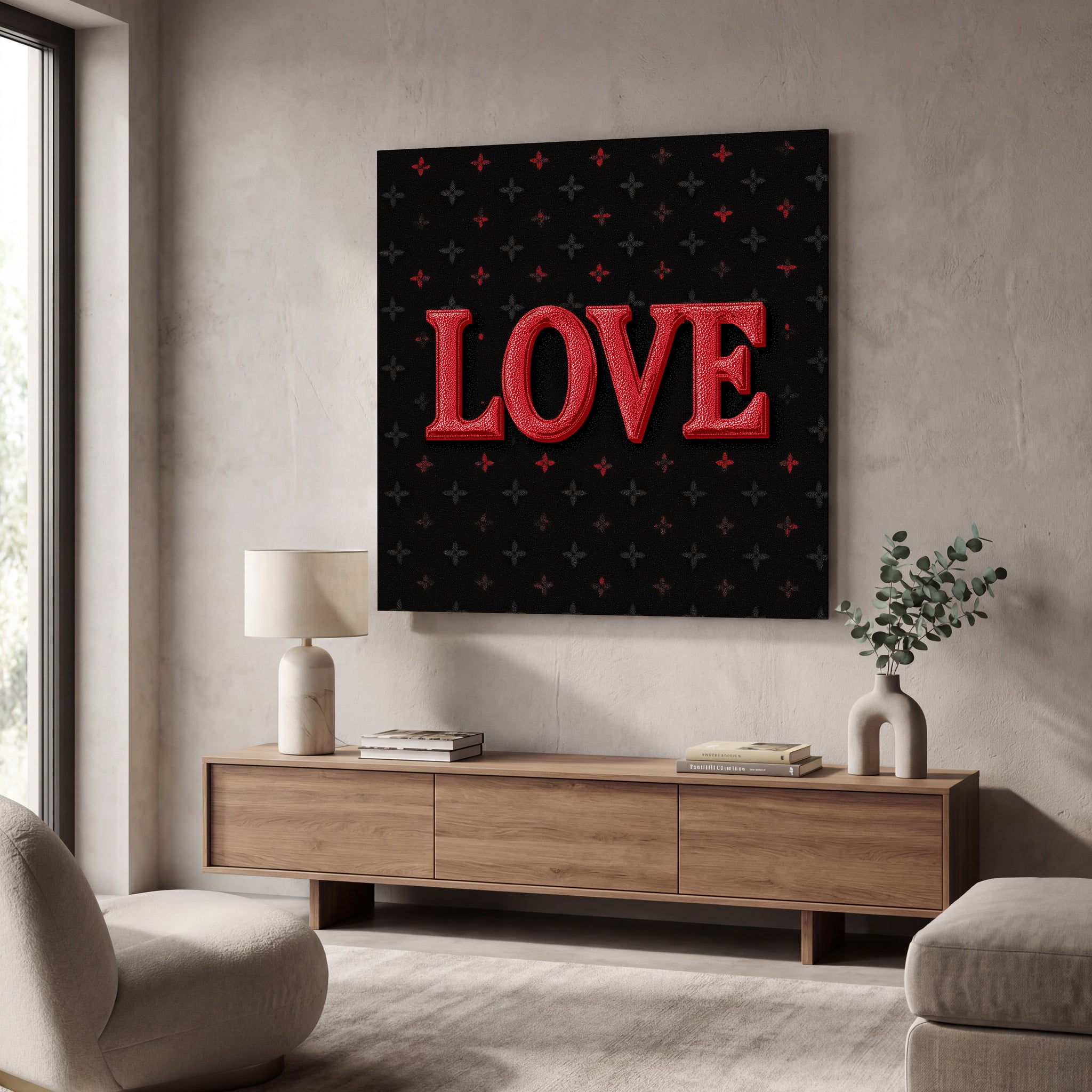 Elevate your interior with this sophisticated, square glass wall art featuring the word “LOVE” in rich crimson lettering against a deep black patterned backdrop. Bold yet elegant, this design blends romance with luxury, creating a striking statement piece that feels modern, dramatic, and timeless all at once.