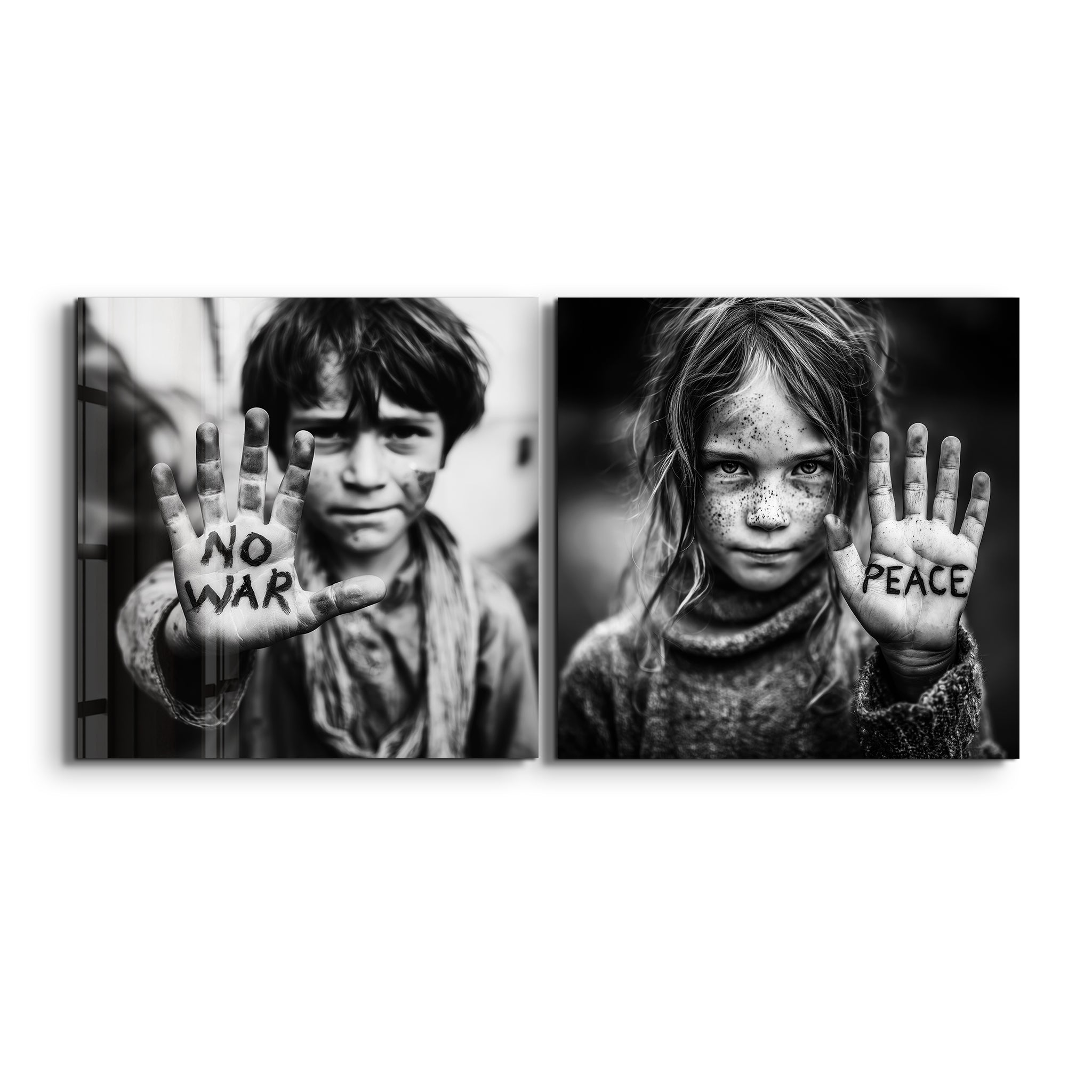Make a meaningful statement with this powerful duo glass wall art set featuring two striking black-and-white child portraits, each raising an open hand with messages of hope, “NO WAR” and “PEACE.” Together, the artworks create an emotional visual narrative about innocence, unity, and the universal desire for a better future.